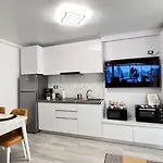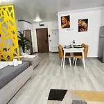 The apartment has a fully equipped kitchen and a microwave oven and a fridge. The 50 m^2 apartment offers access to Mihail Kogalniceanu International airport, located within 29 minutes by car.